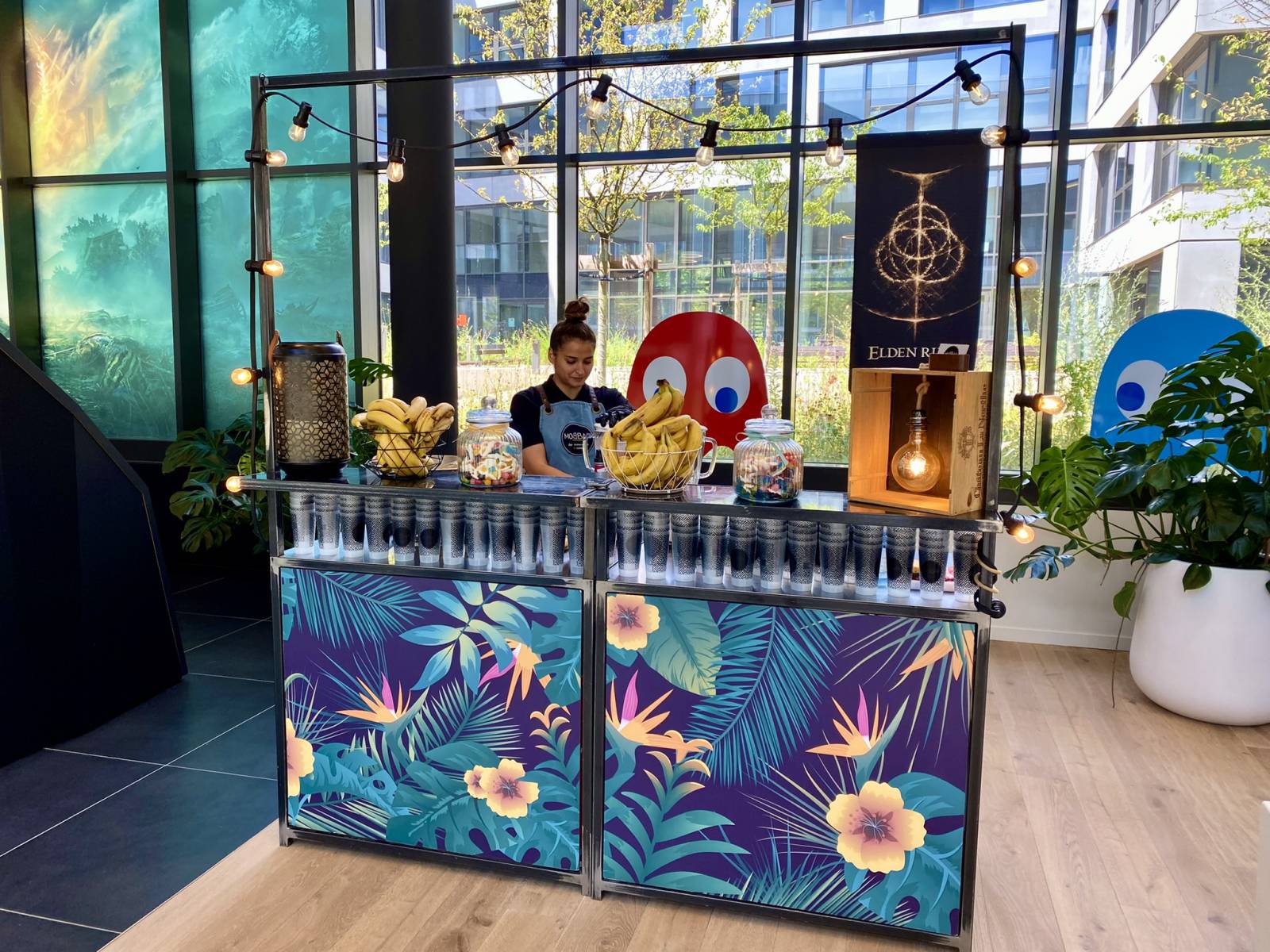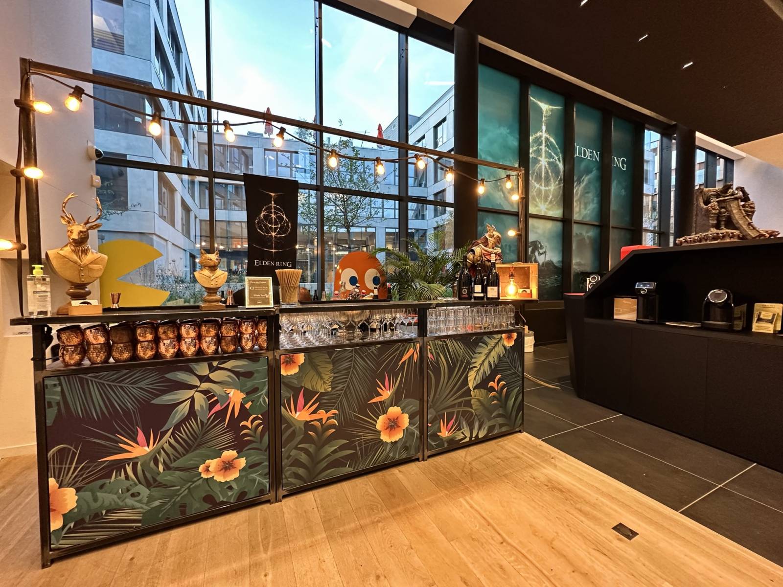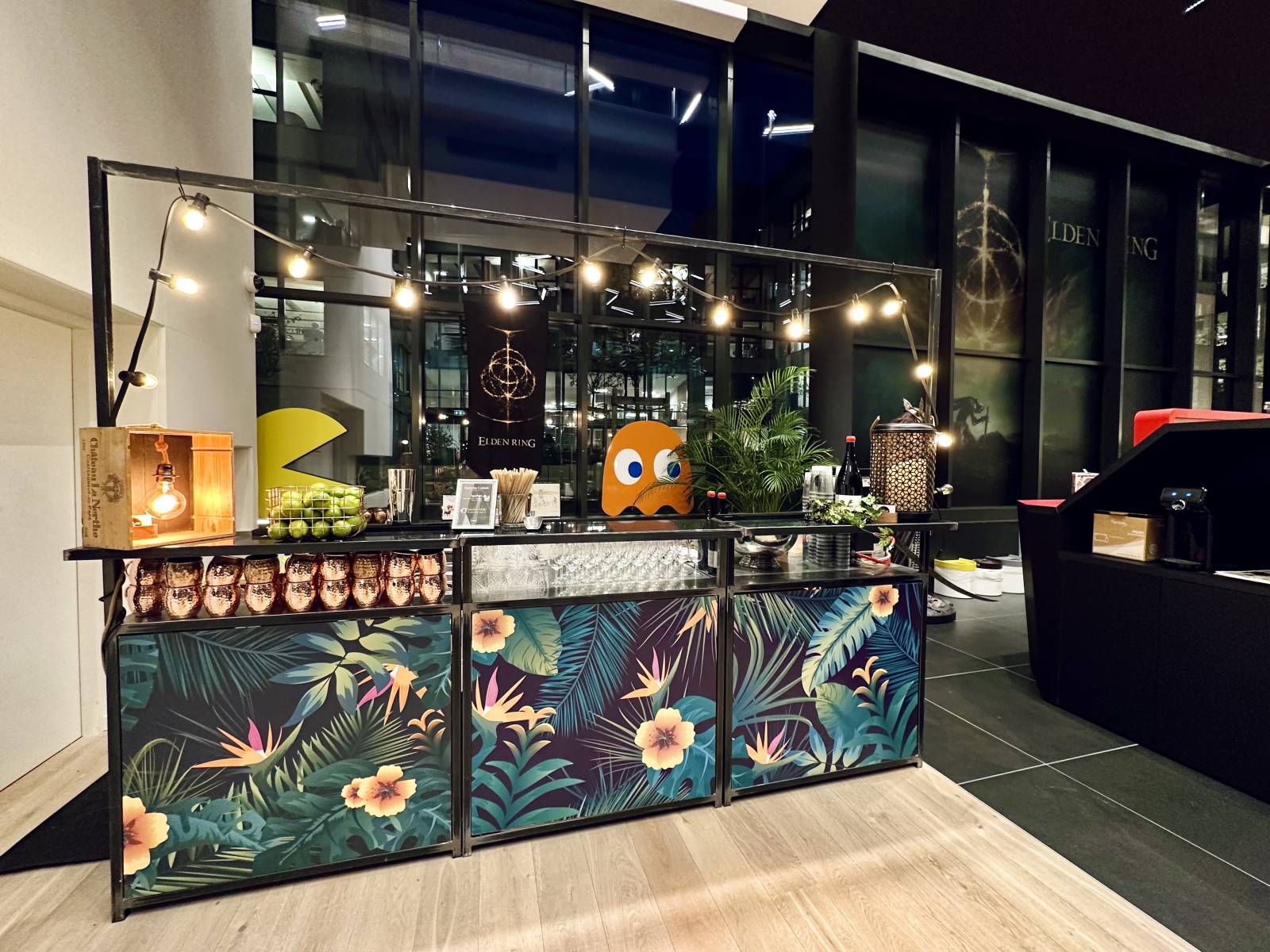 Habitué à réaliser de nombreux événements, notre client souhaitait changer de concept et des traditionnels buffets traiteurs et services de boissons classique. L’idée du Bar à Cocktail mobile installé directement dans leurs locaux à Lyon les a tout de suite séduits ! Dans le magnifique hall du siège de l’entreprise, moderne et très spacieux, certains remarqueront la décoration geek soignée, d’autres les nombreuses récompenses affichées aux murs. Nous, on y voit un terrain de jeu pour des Bars à Cocktail éphémères !