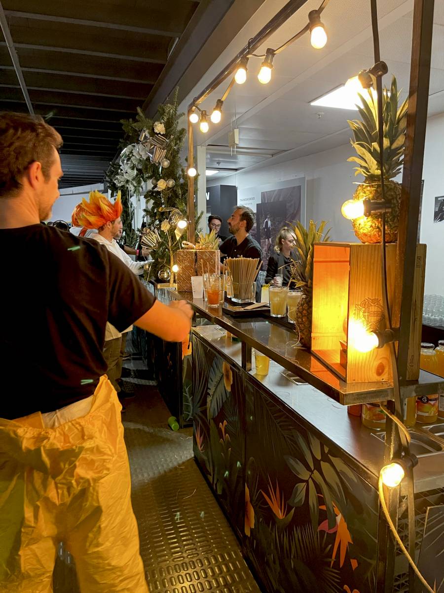 Pour cet événement professionnel festif, nous avons installé un Bar mobile de 5 mètres aux couleurs de Noël et une équipe de 5 barmans professionnels. En 4h de service nos barmans ont réalisé plus de 850 cocktails sans alcool. Pour cette christmas party, le client à opté pour des mocktails personnalisés sur le thème de Noël. Un Cocktail hivernal, à la pomme, poire et épices et un Cocktail tropical et exotique en accord avec le thème de la soirée.